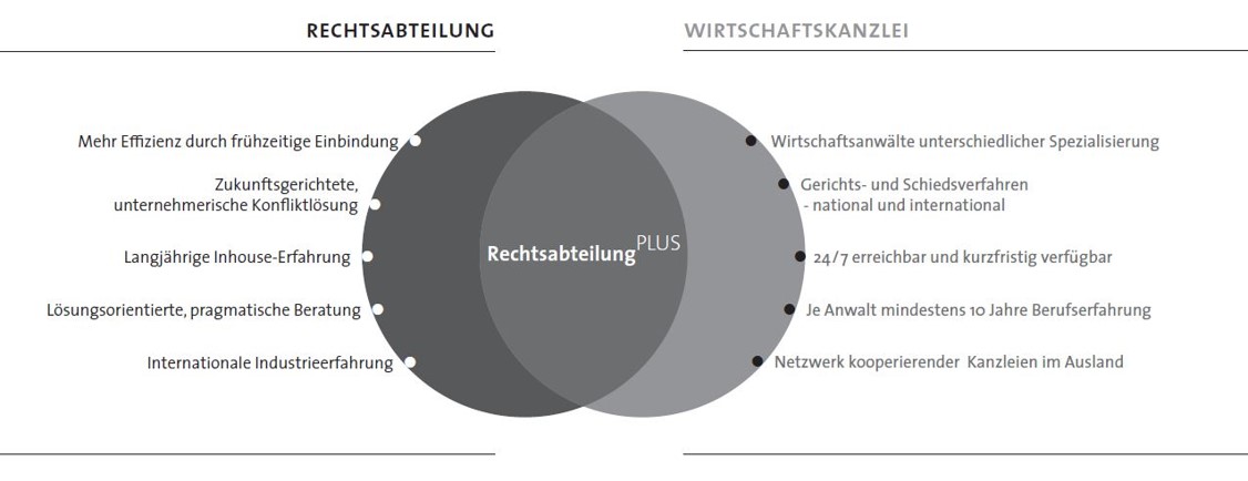Das Beratungsprodukt RechtsabteilungPLUS findet bei Mandanten von adjuga großen Anklang. Es verbindet die Vorteile einer Rechtsabteilung mit den Vorzügen einer Wirtschaftskanzlei. Die beigefügten Grafiken zeigen eine Visualisierung von RechtsabteilungPLUS. Gerne erläutern wir diesen Beratungsansatz und das dahinter stehende innovative Vergütungsmodell näher in einem persönlichen Gespräch.