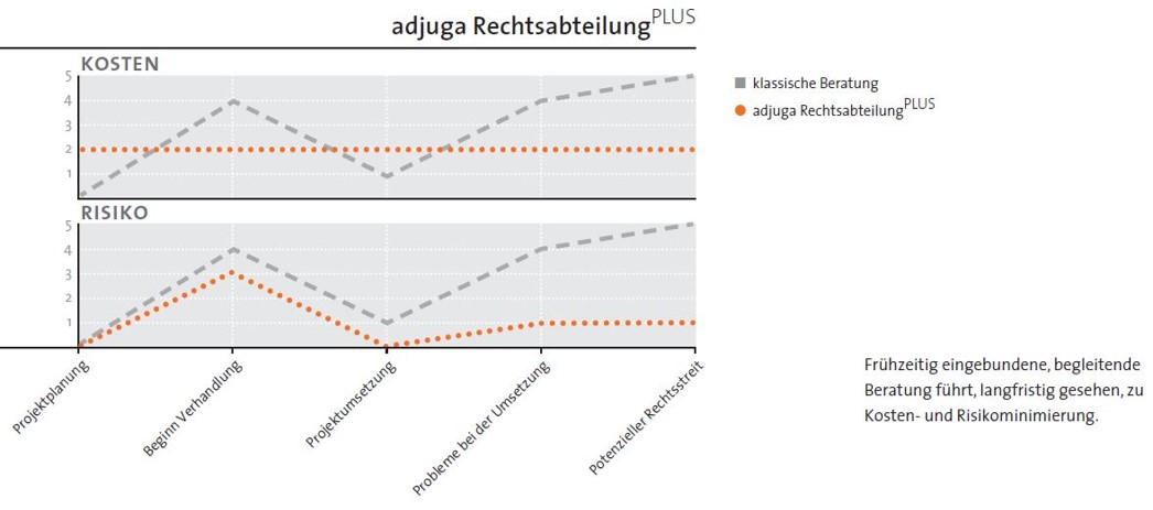 Das Beratungsprodukt RechtsabteilungPLUS findet bei Mandanten von adjuga großen Anklang. Es verbindet die Vorteile einer Rechtsabteilung mit den Vorzügen einer Wirtschaftskanzlei. Die beigefügten Grafiken zeigen eine Visualisierung von RechtsabteilungPLUS. Gerne erläutern wir diesen Beratungsansatz und das dahinter stehende innovative Vergütungsmodell näher in einem persönlichen Gespräch.